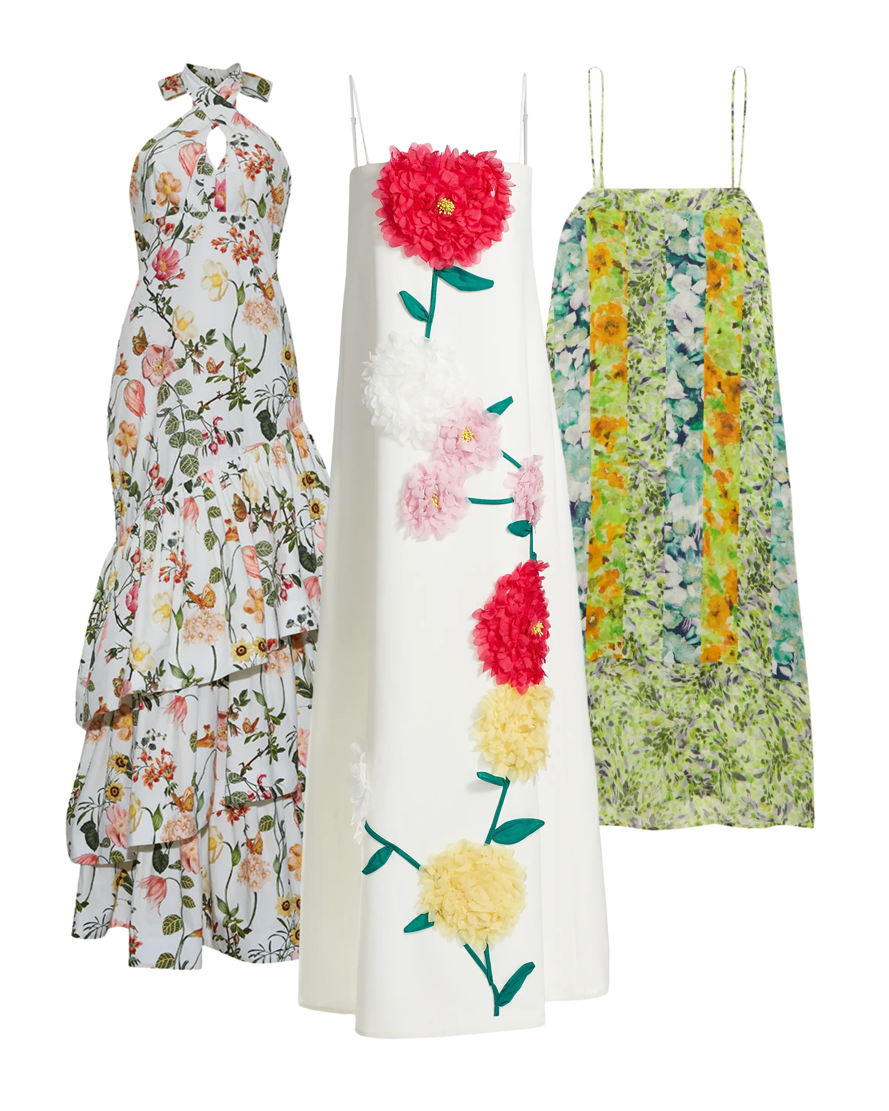 Staud's Dena Dress in Black Woodblock Floral ($395) was the contemporary choice for those who want florals but prefer a more graphic approach that can be dressed up or down. And for those willing to go mini who still want to embrace the trend, we saw several Cara Cara pieces, including the Mackenzie floral-print cotton-blend mini ($425).