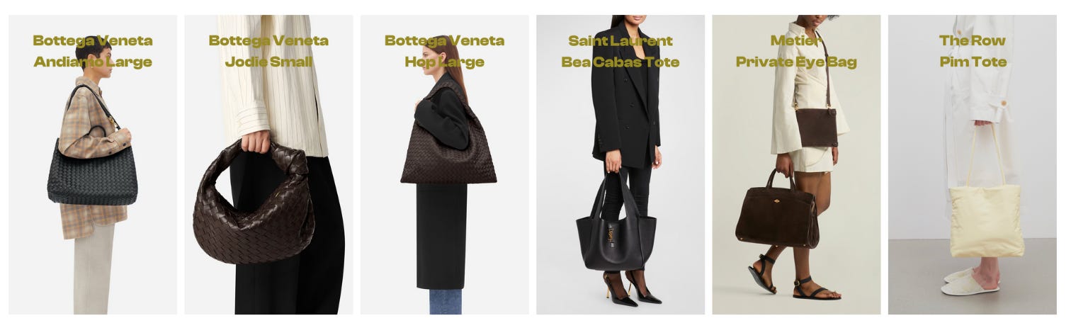 In the last few months, we’ve seen investing in larger totes and bags - a lot of Matthieu Blazy’s Bottega Veneta in the Andiamo, Hop, and Jodie styles, especially in the color Fondant. There were also several YSL totes, most frequently the Bea Cabas and Large Le 5 a 7 tote. Emerging luxury brand of the season goes to Metier, which we’ve seen the always fabulous