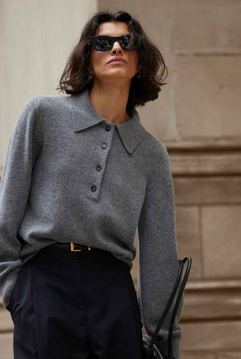 Looking at what our community is buying right now, a few pieces keep showing up. The Cashmere Polo in grey is a favorite — it’s a knit that layers under a blazer or wears on its own. Also, I’ve learned that cheap cashmere is never worth it, but this feels like the right price for quality. The Everything Shirt in black or white is another repeat across closets. It’s structured and polished but relaxed. And lastly, the Long Sleeve Perfect Tee is the most classic of classics and is in multiple closets.