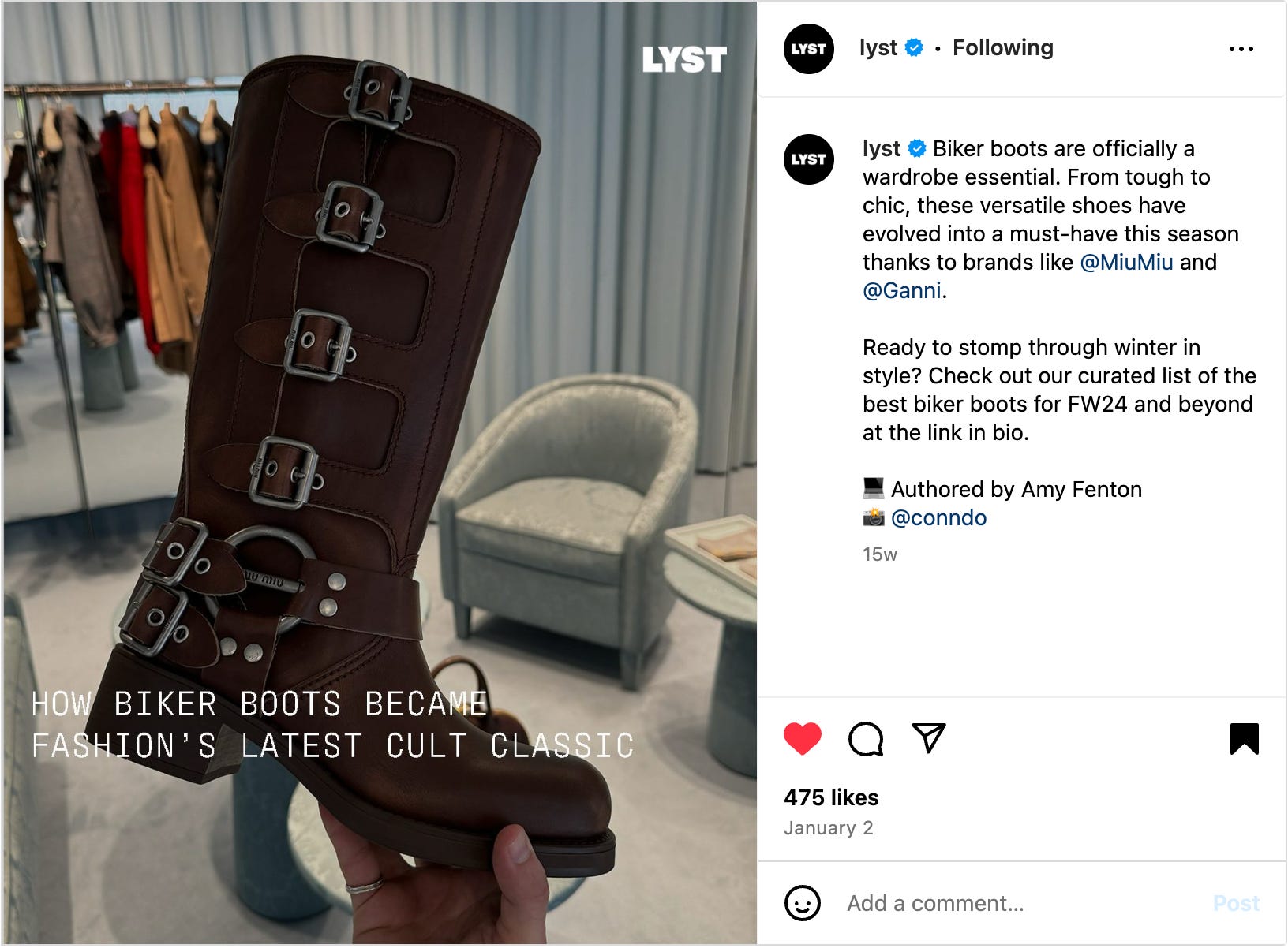 Biker boots are the pieces to sell this spring. According to Lyst, Ganni and Miu Miu are leading this trend, creating strong resale value in these brands and footwear with a similar aesthetic. Ganni’s biker boots are in sell down mode across retailers and Miu Miu’s boots sell for over $2.5K new, making the secondhand market even more compelling. Even better? Our data shows that Miu Miu’s average resale price has doubled in the last six months, and Ganni has increased 15% in the last month alone.